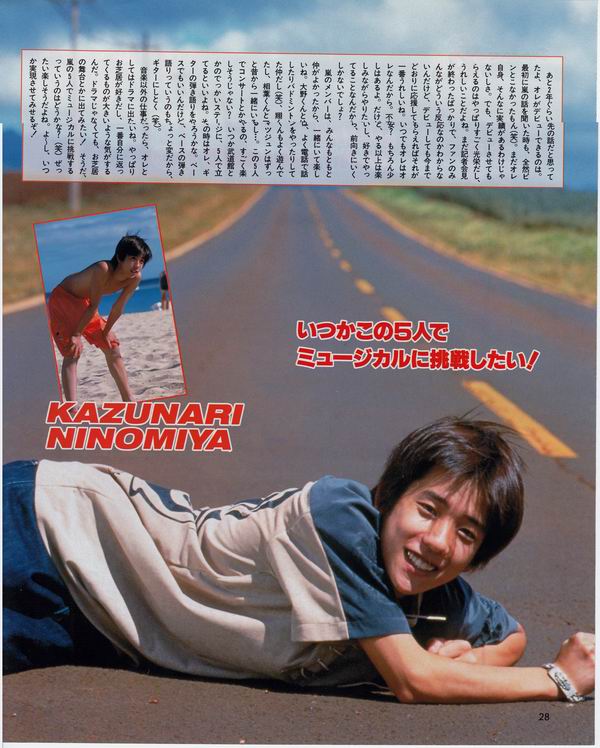 arashi的成员,大家原来关系就很好,在一起很开心呢。经常会和Ohnno kun聊电话,也是会一起打羽毛球的伙伴(笑)。和Sho kun也经常一起玩,Aiba kun和Matsu Jun从以前开始就一直在一起……。这五个人开CON的话不是很开心吧?什么时候五个人能站上武道馆之类的大场地的话就好了呢。那个时候我会边弹吉他边唱的吧。贝斯也不错,但是边弹贝斯边唱果然还是有点奇怪,所以还是用吉他吧(笑)。