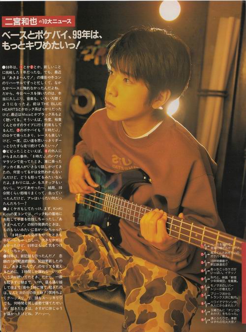 98年是挑战了像①和②这种新事物的一年。不过,最近因为「あきまへんで!」的拍摄和冬CON的彩排一直很忙,都很少能碰一下贝斯。所以,今天是真的久违地弹了贝斯呢。也变得开始听各种音乐了。以前都只听THE BLUE HEARTS和摇滚系,最近也会听Misia和黑人音乐了。这么说来,和裕貴kun约好了下次一起去看ゆず的live呢。②的迷你摩托也是在「8時だJ」的外景里第一次骑。虽然比赛也很开心,但是还是想在宽阔的道路上随意地冲出去肆意地奔走呢。
