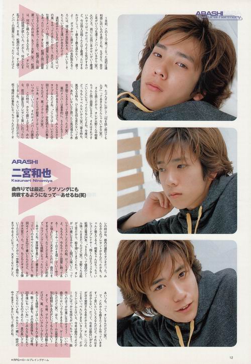 1年前,这样的五个人组成Arashi的时候,有着类似违和感的感觉。要说为什么的话,因为有和自己年龄相差不少的member(笑)。Jr的时候,觉得周围都是同年或者只差一岁的家伙,现在的话比如说和Sho kun就要差2岁。1岁和2岁没什么区别?才不是!在我终于可以拿到骑小绵羊的驾照的时候,他已经可以拿车的驾照了,类似于这样…就是有这么大的差别啊!